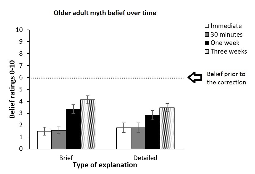 One concern that stems from our data is that people over the age of 65 are potentially worse than middle-aged and younger adults at sustaining their post-correction belief that myths are inaccurate. It is therefore even more important that we not only understand the underlying mechanisms of why people continue to believe in inaccurate information, but develop techniques to facilitate evidence-based updating, so that all sectors of the population can be on the same page as to what is fact and what is fiction.
